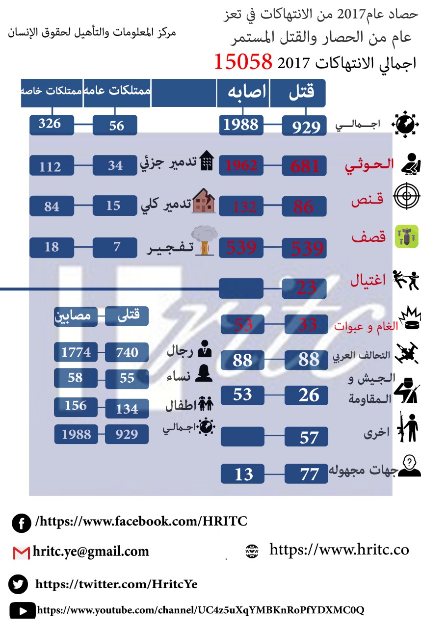 رصد مركز المعلومات والتأهيل لحقوق الانسان HRTC”” 15058 انتهاكا لحقوق الانسان في محافظة تعز خلال العام 2017.