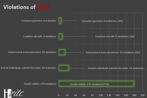 Several human rights reports documented serious human rights violations in Taiz during 2024. According to Rights Radar, armed militias, including the Houthis, committed approximately 2,368 violations in Yemen, including shelling, mines, and explosive devices. The violations in Taiz Governorate amounted to 146 cases.